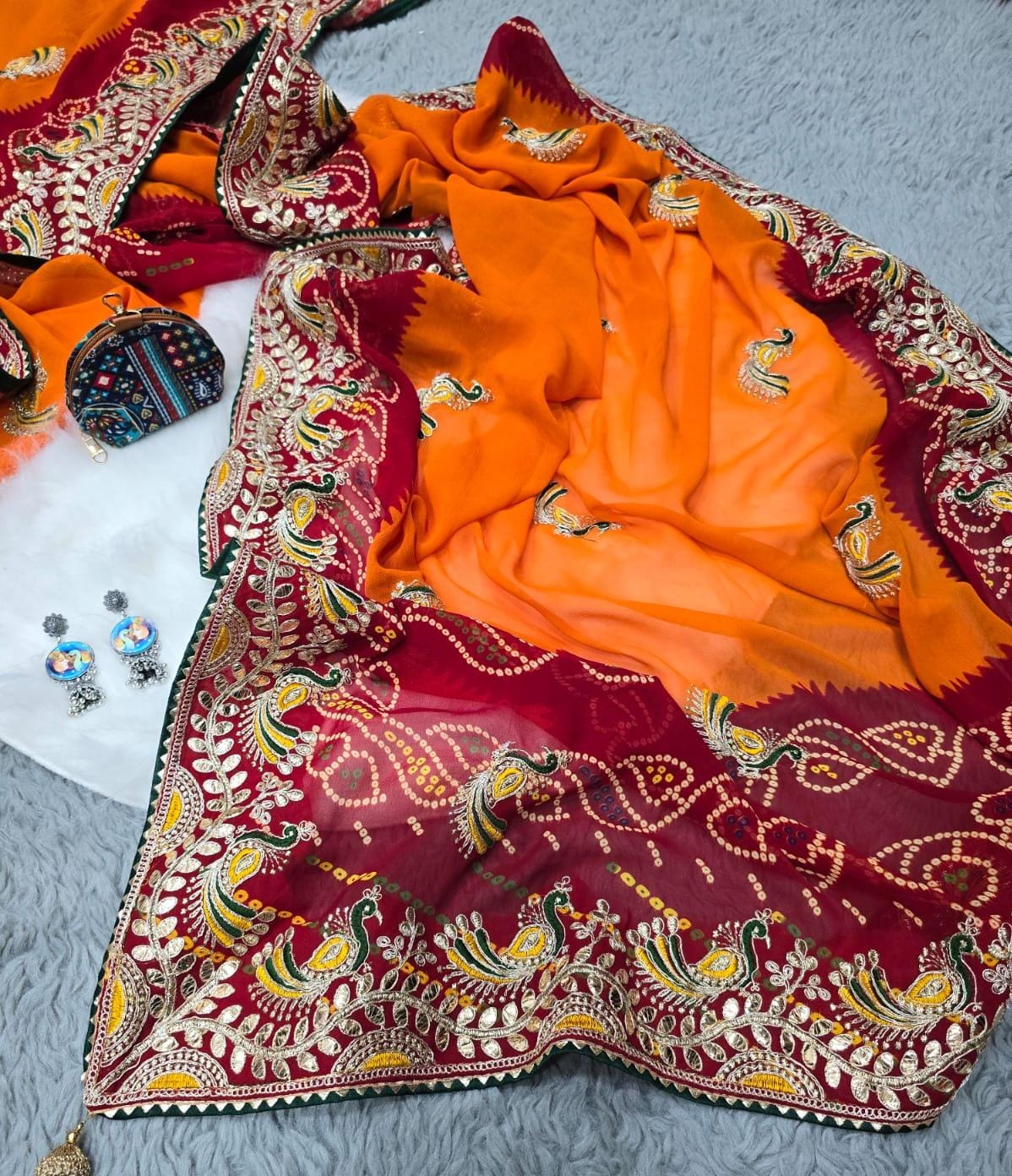 Fabric nd detail :- *heavy georgatte bandhej saree with beautiful C-pallu with thred and gottpati work in all saree with multi nd coding work with rich look piping and heavy latkan on pallu thats give you a rich look👌*