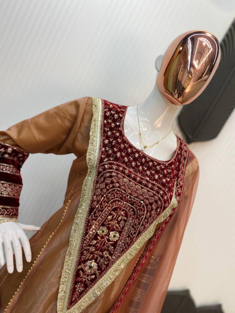WORK : IN YOKE VELVET EMBROIDERY SEQUENCE WORK WITH LACE AND SAMOSA LACE ON KALI JOINTS
