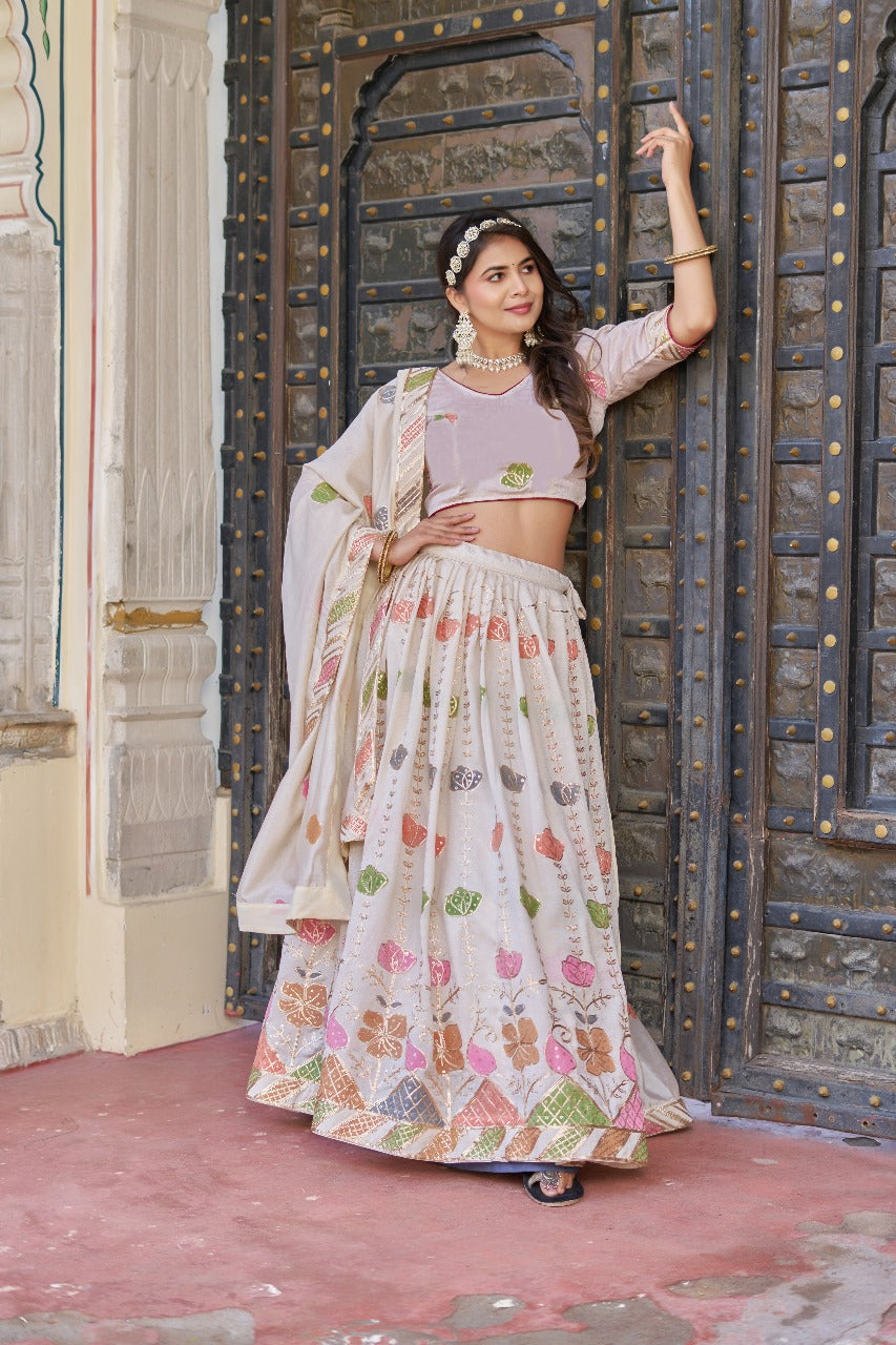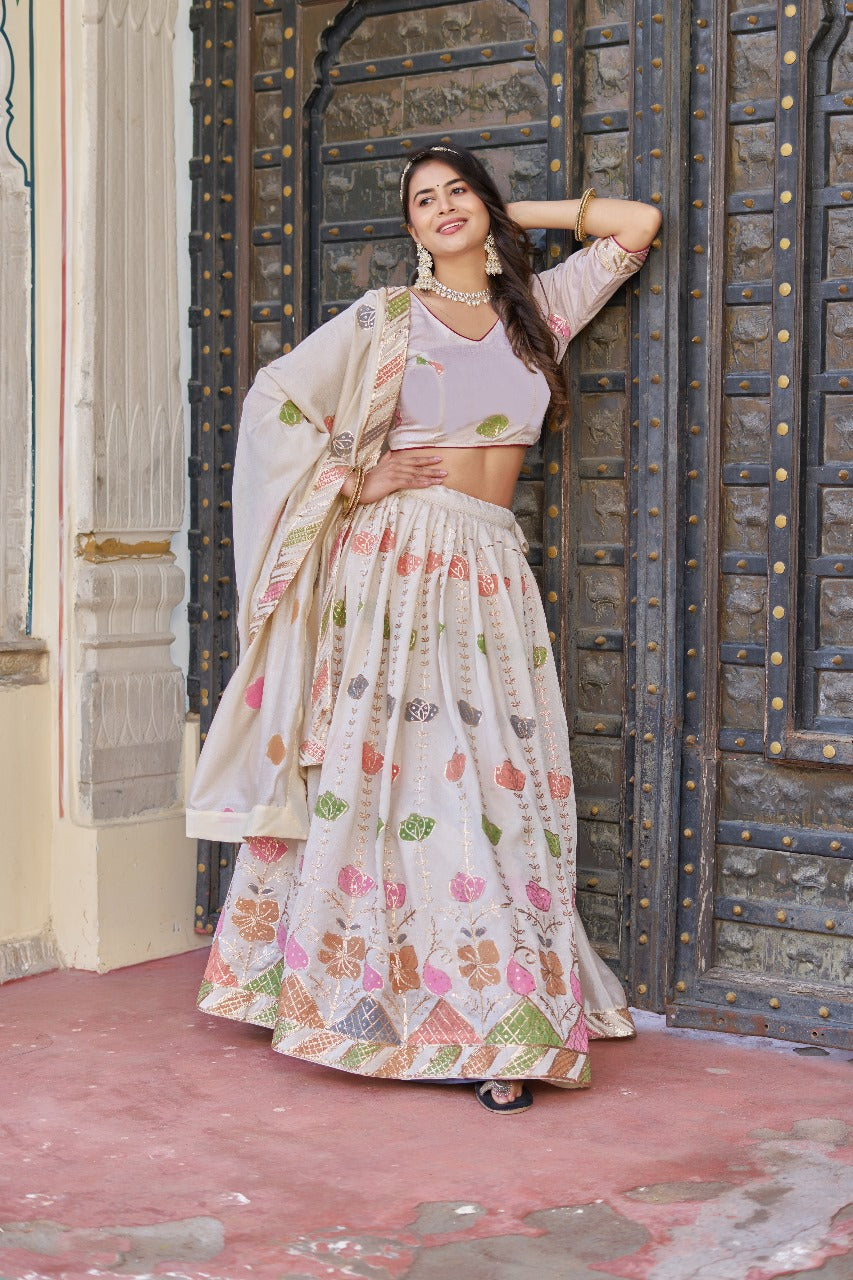 Lehenga work : Sequins and Thread Embroidery Work and Hand print With Lace Touch Up