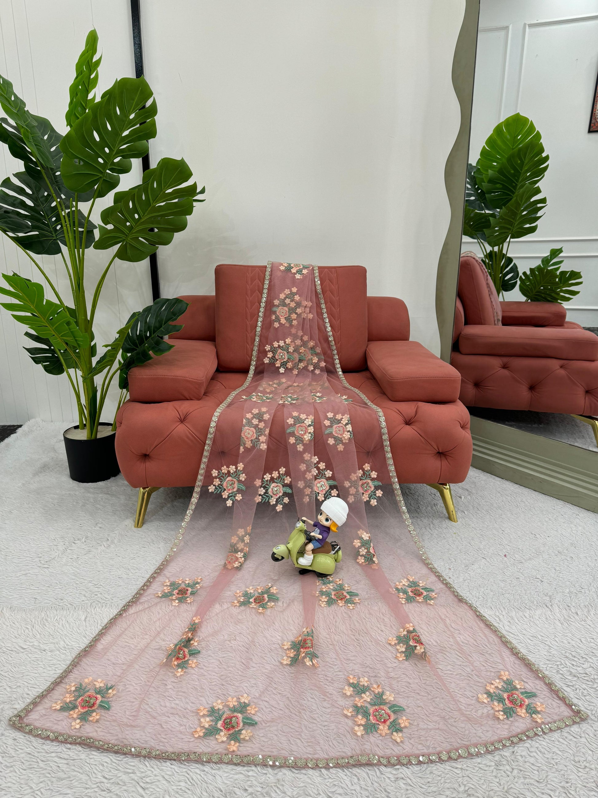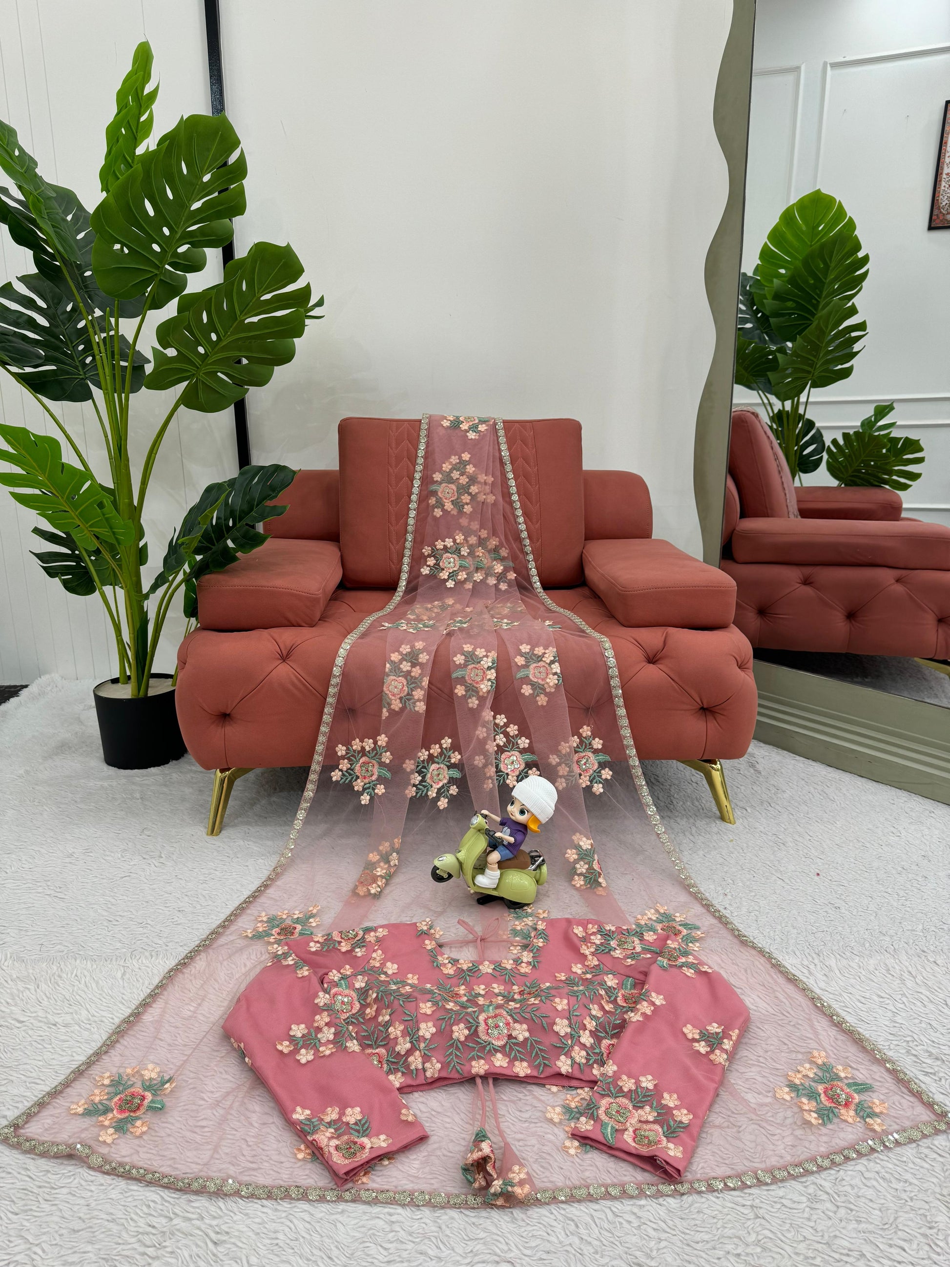 Beautiful Designer Saree on Soft Net Febric with Thred & Sequnce work and blouse on also Soft Net Fabric with Thred & Sequnce work.
