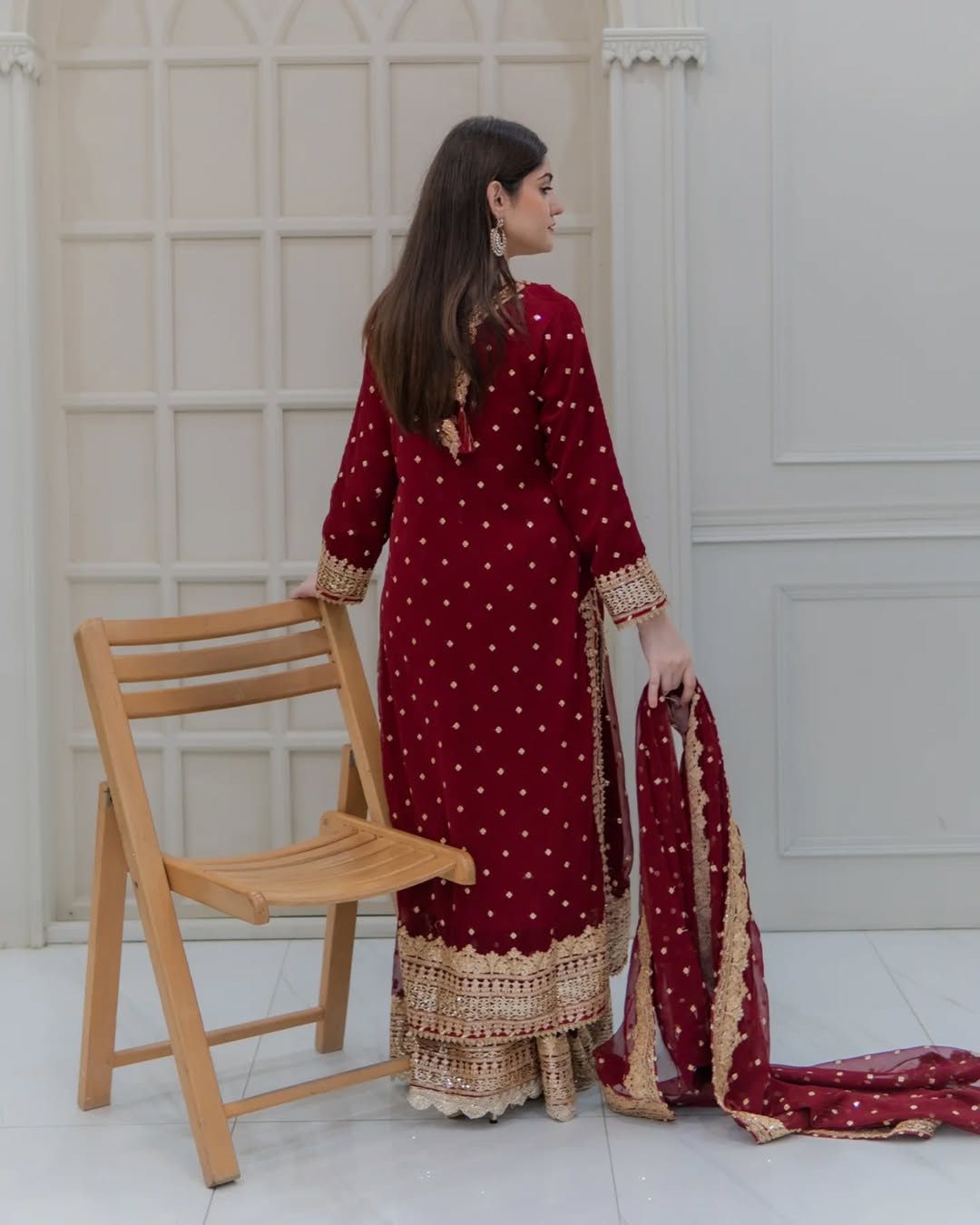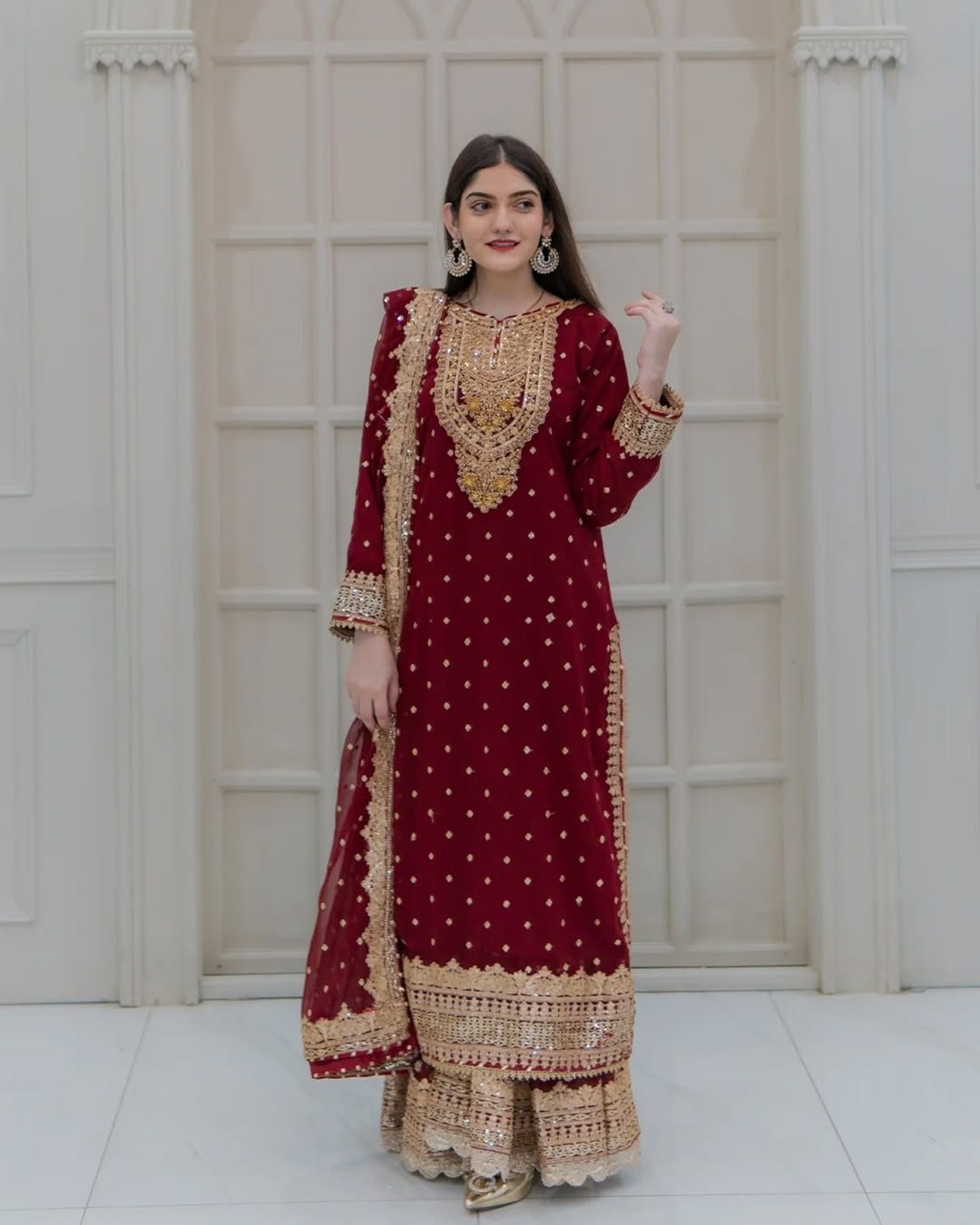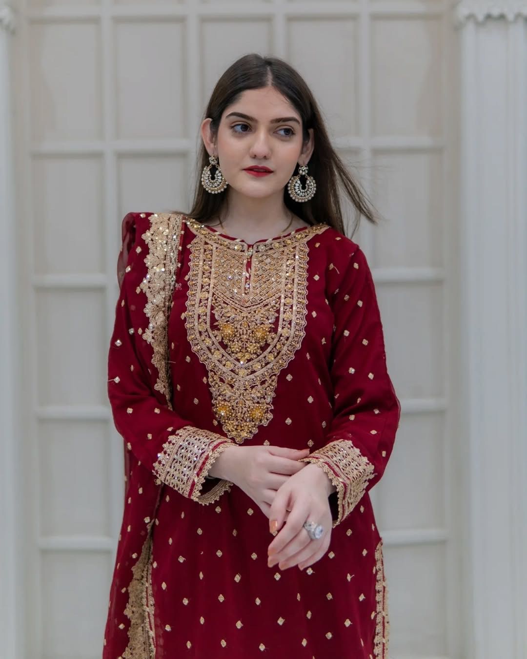 Top Fabric :Pure Heavy georgette With *Heavy Embroidery Sequence Work front and back and neck moti work* With Full Sleeves ,