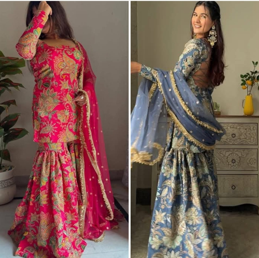 *EXCLUSIVE DESIGNER HEAVY CHINON WITH SEQUANCE EMBROIDERY WORK SUIT WITH FULL FLAIR WORK SHARARA*