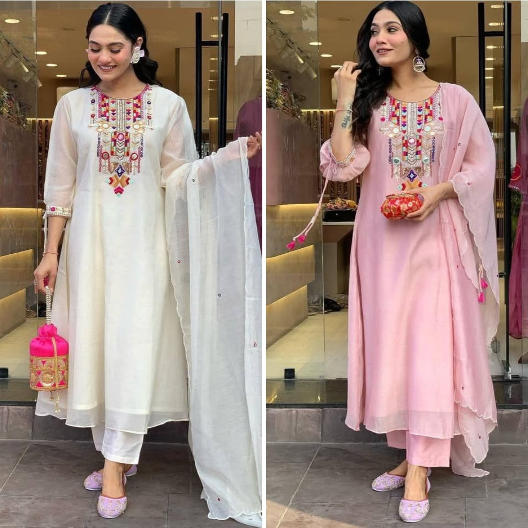 *Premium Chanderi, known for its lightweight texture and subtle sheen. Intricate mirror work embroidery, adding elegance and vibrance. Embroidery pattern features a colorful and detailed design at the neckline and cuffs.*